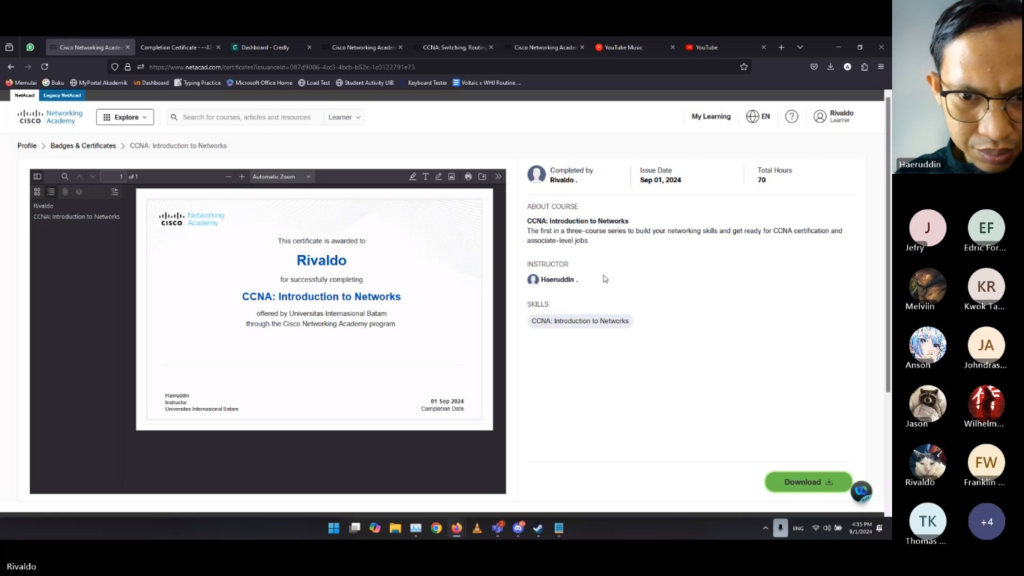 Pelaksanaan Sertifikasi Cisco Certified Network Associate (CCNA) Batch 2 Untuk Mahasiswa Universitas Internasional Batam Program Studi Teknologi Informasi Semester 3-7