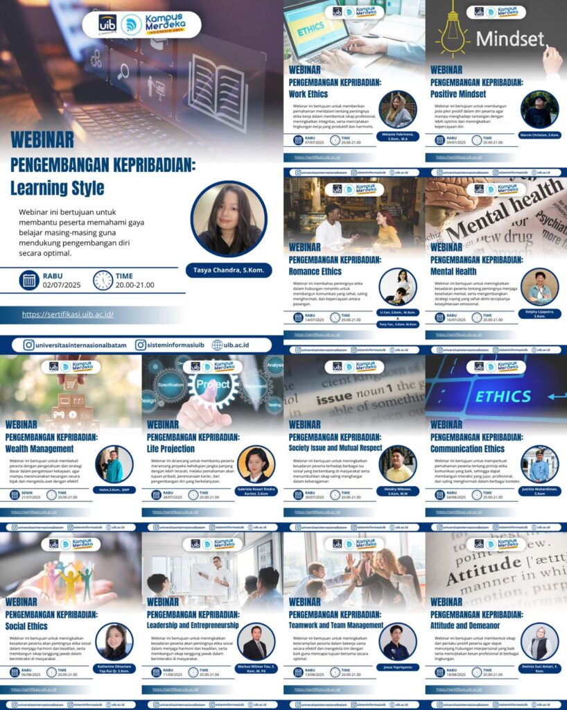 Penulis: Yefta Christian, S.Kom., M.Kom | Editor: Ambarwulan, S.T. Program Studi Sistem Informasi Universitas Internasional Batam (UIB) kembali mengadakan kegiatan Webinar Pengembangan Kepribadian 2025, sebuah rangkaian webinar yang dirancang untuk membantu mahasiswa mengasah karakter, etika, dan keterampilan sosial yang menjadi bekal penting dalam dunia kerja maupun kehidupan bermasyarakat. Pengembangan kepribadian merupakan proses penting yang mengasah […]