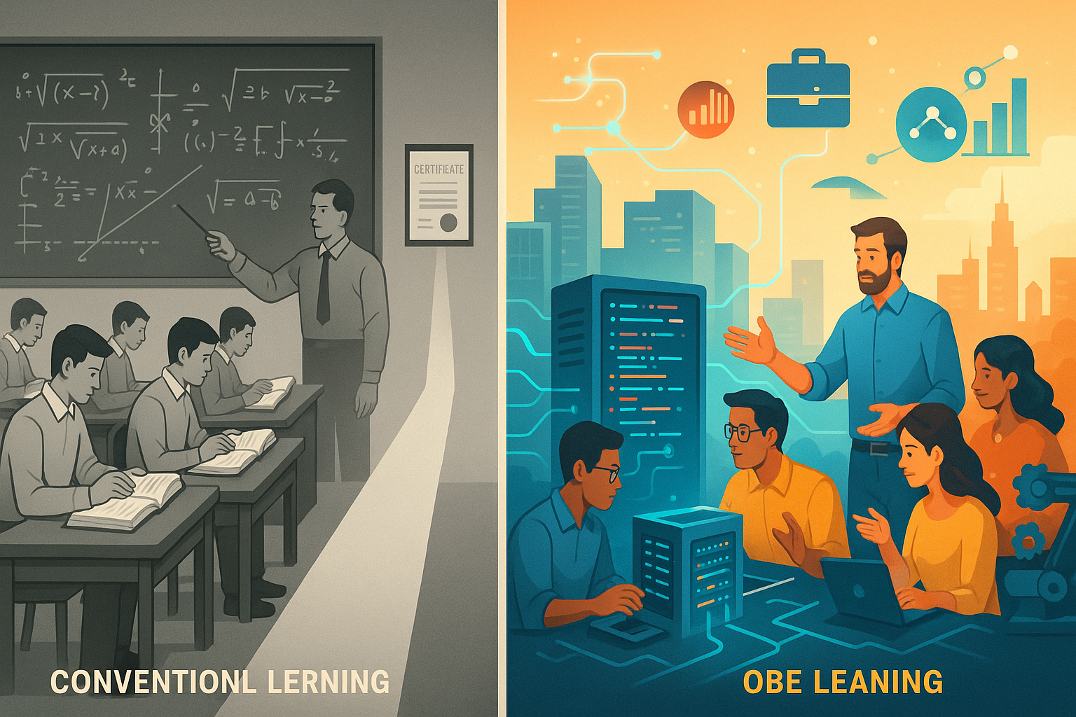 Perbedaan antara pembelajaran OBE dan konvensional tidak hanya terletak pada metode mengajar, tetapi pada filosofi inti pendidikan. Jika pendidikan konvensional menitikberatkan pada penyampaian materi dan evaluasi berbasis ujian, OBE memusatkan perhatian pada kompetensi akhir yang harus benar-benar dimiliki oleh mahasiswa ketika mereka lulus. Inilah yang membuat OBE dianggap lebih sesuai dengan kebutuhan era digital.