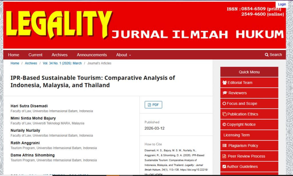 Dosen Hukum dan Pariwisata UIB Publikasikan Riset pada Jurnal Internasional SCOPUS Q1 tentang Pariwisata Berkelanjutan Berbasis Kekayaan Intelektual