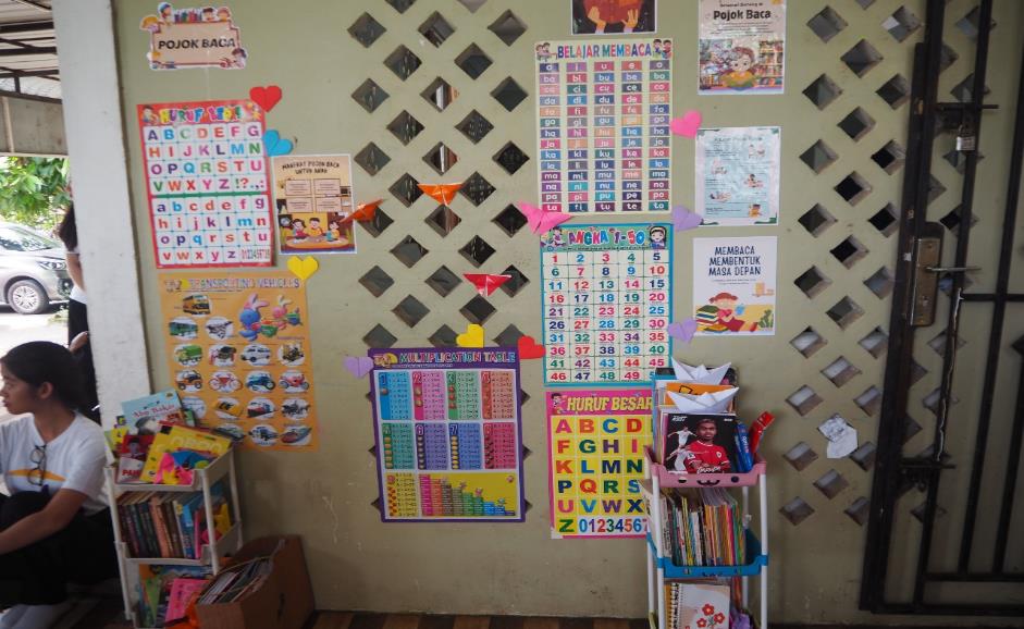 Saat permainan berlangsung, Kelompok Bukit Holbung 3 mulai membuat pojok baca yang dibuat khusus untuk anak-anak panti. Rak buku disusun dengan rapi dan diisi dengan berbagai bacaan yang menarik. Pojok baca juga dihias dengan origami-origami yang dilipat dengan bentuk-bentuk yang indah. Pojok baca dilengkapi dengan tabel perkalian, poster jenis kendaraan dan poster-poster lainnya. Pojok baca ini diharapkan dapat meningkatkan minat baca anak-anak panti.hg