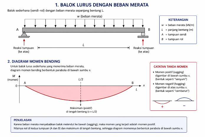 Jika balok lurus sederhana diberi beban merata, maka akan timbul momen lentur terbesar di tengah bentang. Diagram momen untuk kasus ini berbentuk parabola, dengan nilai nol di tumpuan dan maksimum di tengah bentang (Hibbeler, 2017).