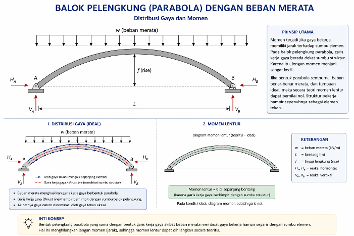 Balok pelengkung parabola memiliki bentuk yang sama seperti diagram momen balok lurus akibat beban merata. Saat beban bekerja, gaya akan cenderung mengikuti bentuk lengkung tersebut dan diteruskan menuju tumpuan.