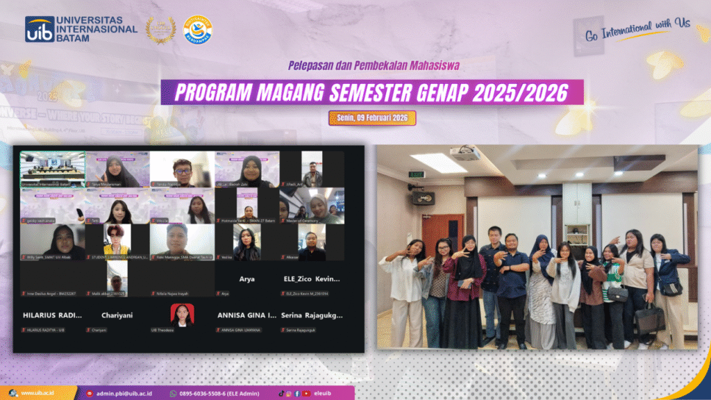 Penulis: Nafa Indah Sasmi, S.Pd. | Editor: Ambarwulan, S.T. Batam, 9 Februari 2026 – Program Studi Pendidikan Bahasa Inggris (PBI), Fakultas Ilmu Pendidikan (FIP), Universitas Internasional Batam (UIB) menyelenggarakan kegiatan Pelepasan dan Pembekalan Mahasiswa Program Magang Semester Genap Tahun Akademik 2025/2026. Kegiatan ini dilaksanakan secara hybrid melalui Zoom Meeting di Ruang Video Conference Gedung A […]