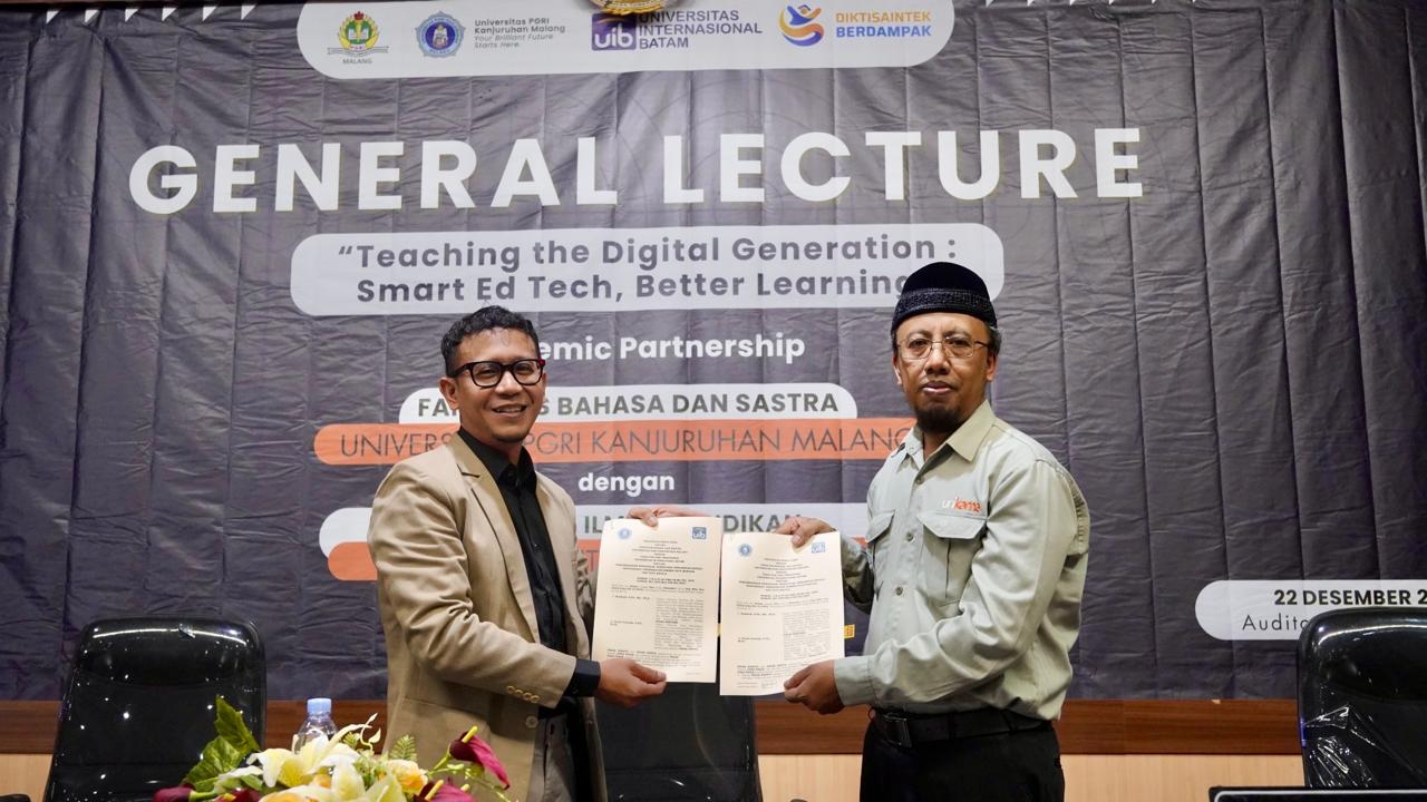 Malang, 22 Desember 2025 – Fakultas Ilmu Pendidikan (FIP) UIB hadir di Fakultas Bahasa dan Sastra (FBS) Universitas PGRI Kanjuruhan Malang (UNIKAMA), dalam rangka penandatanganan nota kesepahaman (MoU) kerja sama antarinstitusi yang dirangkaikan dengan kegiatan dosen outbound melalui General Lecture bertajuk “Teaching the Digital Generation: Smart Ed Tech, Better Learning”. Kegiatan yang berlangsung di Auditorium Multikultural Unikama ini menjadi wujud nyata peran aktif FIP UIB dalam memperluas jejaring akademik dan menjawab tantangan pendidikan di era digital.