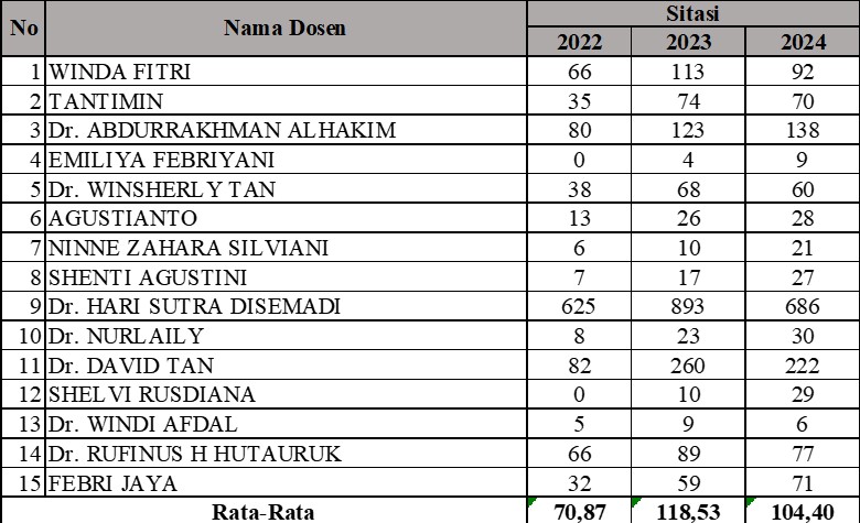 Capaian ini mencerminkan dedikasi dosen-dosen Program Sarjana Hukum UIB dalam mempublikasikan karya ilmiah yang relevan dan memiliki dampak di bidang hukum. Dosen seperti Dr. Hari Sutra Disemadi, yang memiliki sitasi tertinggi selama periode tersebut, menunjukkan kontribusi luar biasa di kancah akademik nasional dan internasional. Kualitas ini tidak hanya memperkuat reputasi Program Sarjana Hukum UIB, tetapi juga membuktikan keseriusan dosen dalam mendukung tridarma perguruan tinggi.
