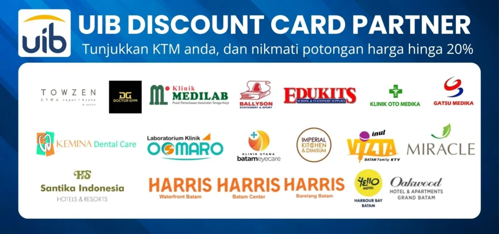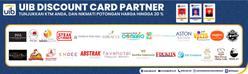 Universitas Internasional Batam’s (UIB) Discount Card is a program that offers various benefits from partners in the form of discounts/rebates or special offers to UIB academic community card holders, such as lecturers, students, alumni and employees. Our partners/merchants can come from various fields, such as food and beverage, entertainment, hotels, sports, beauty and so on. This program has been implemented for approximately 10 years and has collaborated with dozens of partners in Batam City. This program will continue to expand to other areas in the Riau Islands Province.
