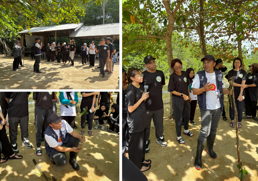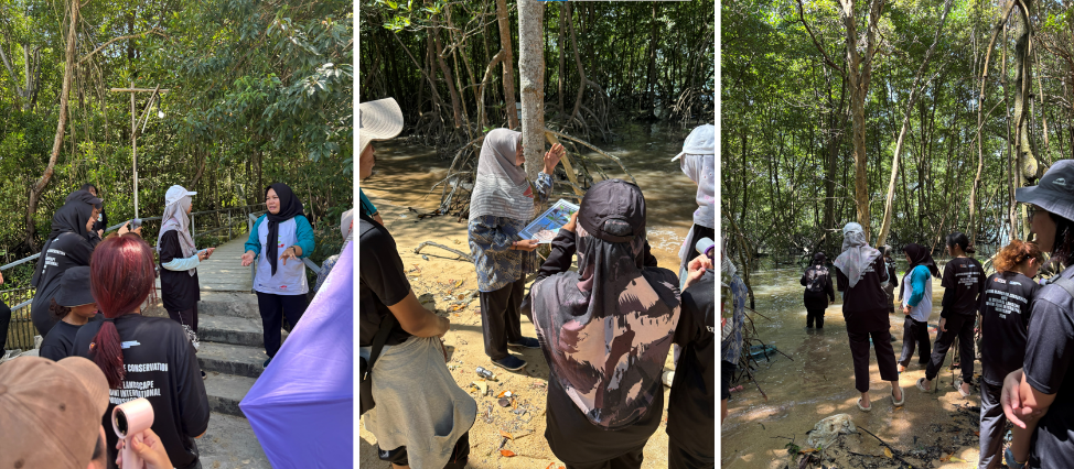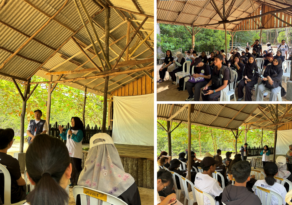 After the welcoming session, participants were guided into the mangrove forest area to begin the educational session. The explanation was delivered in English by Ms. Intan to ensure understanding by Malaysian students. She elaborated on the history and development of Ekowisata Mangrove Pandang Tak Jemu, the various mangrove species found within the area, accompanying flora and fauna, and the many uses of mangrove plants—including tea, coffee, and traditional medicines. She also explained how mangrove trees grow, either naturally through propagules or manually through nursery planting. Ms. Intan further highlighted the ecological importance of mangroves, including their capability to produce more oxygen than rainforests and their role in preventing coastal abrasion. Ms. Intan also stated “Therefore, we must protect mangrove forests because they provide great benefits to the earth; including the air we currently breathe.” She also shared interesting facts, such as the edible nature of mangrove fruits, which are difficult to find because most are consumed by animals—especially monkeys—before ripening.