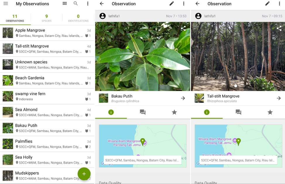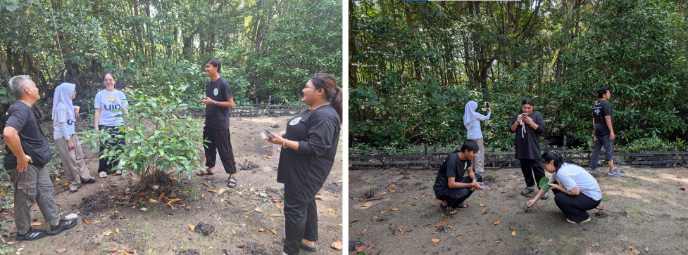 Participants then took a guided walk through the mangrove area, where they observed diverse vegetation and wildlife. Many students enthusiastically took photos and noted their findings. Before noon, participants reconvened to receive instructions for the observation activity from Dr. Rohana. She introduced the iNaturalist application as a digital tool to support field documentation. Using this app, students could take photos of plants and animals, which would then be automatically identified. The app connects users with scientific communities and stores valuable environmental data for future analysis. After ensuring all students had installed the application, the session paused for lunch and Friday prayers.