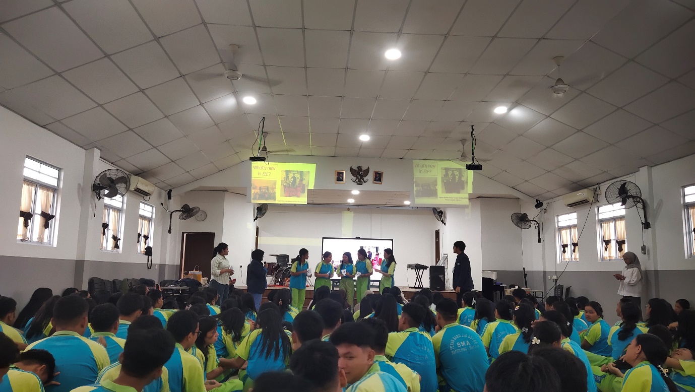 Batam, 11 Desember 2025 – Program Studi Pendidikan Bahasa Inggris (PBI) Universitas Internasional Batam (UIB) kembali menyelenggarakan kegiatan ELE Goes to School: English Educational Games pada semester ganjil Tahun Akademik 2025/2026. Kegiatan ini dilaksanakan pada Rabu, 11 Desember 2025, bertempat di Aula SMA Tunas Baru Jin Seung Batam, mulai pukul 07.00 hingga 10.30 WIB, dengan melibatkan seluruh siswa kelas XII sebagai peserta, dengan jumlah kurang lebih 180 orang. Kegiatan ini menjadi bagian dari program class meeting sekolah yang dikemas secara edukatif dan interaktif.