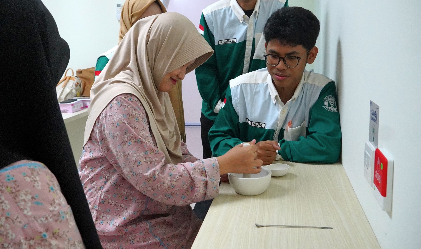 2. Medication Preparation: Di sini, peserta berperan layaknya tenaga farmasi medis. Mereka belajar cara menghitung dosis obat yang tepat berdasarkan resep dokter serta mencoba langsung teknik menggerus obat menggunakan mortir dan stamper agar siap dikonsumsi.