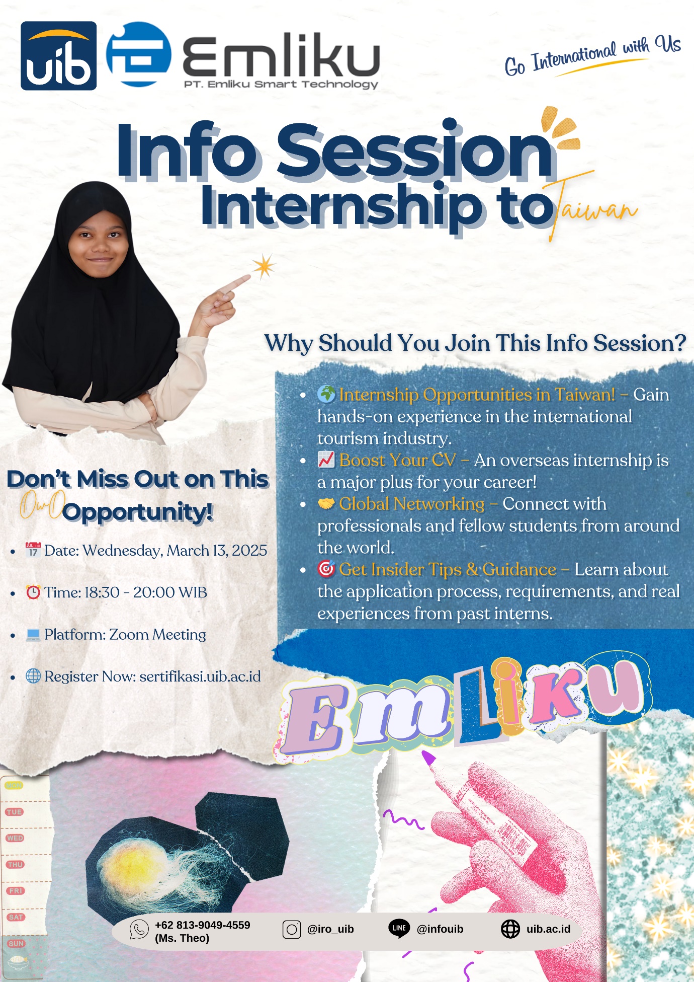 UIB x Smart Emliku proudly present: “Info Session Internship to Taiwan” – a special session for UIB Tourism students who want to gain hands-on work experience in Taiwan! 🚀