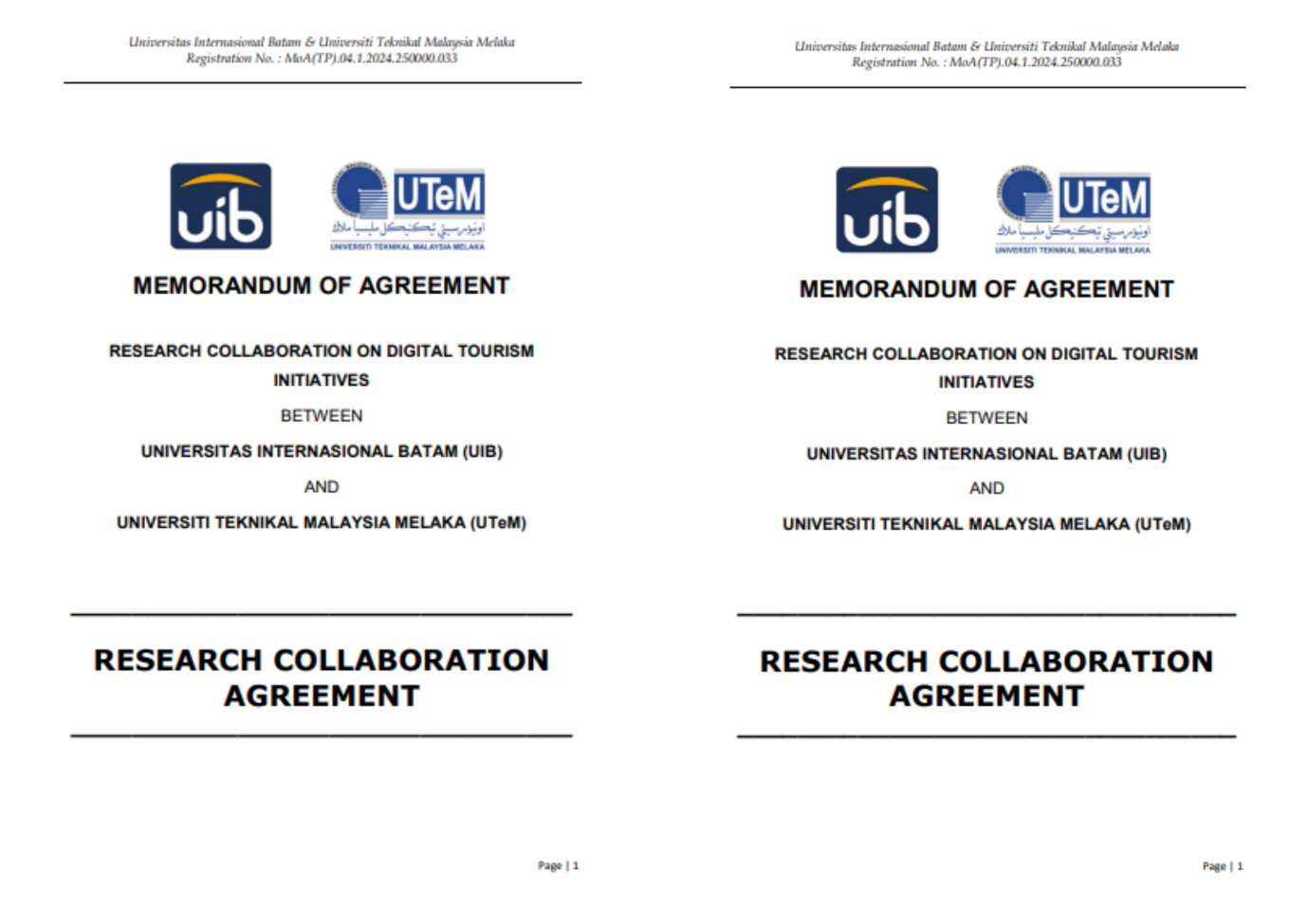Universitas Internasional Batam (UIB) terus memperkuat perannya sebagai mitra riset global dengan menjalin kolaborasi bersama Universiti Teknikal Malaysia Melaka (UTeM) dalam dua proyek penelitian internasional melalui skema matching grant. Kerja sama ini secara resmi ditandai dengan penandatanganan Memorandum of Agreement (MoA) pada 11 September 2024, yang menjadi fondasi penting bagi kolaborasi jangka panjang berbasis inovasi antara kedua institusi.