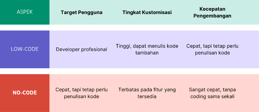 Sementara itu, No-Code benar-benar zero coding. Kamu tinggal klik, geser, pilih fitur yang kamu mau… jadi deh aplikasinya! Ini cocok banget buat pebisnis, admin, atau siapa pun yang pengin bikin aplikasi tapi nggak bisa ngoding.