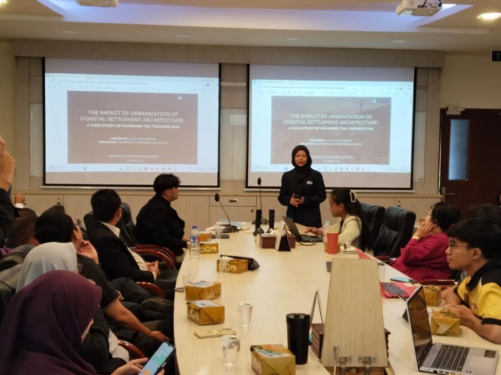 Dalam kesempatan tersebut, mahasiswa Arsitektur UIB, yang diwakilkan oleh Julfa Sindy Savana dari angkatan 2023, mempresentasikan penelitian berjudul “The Impact of Urbanization of Coastal Settlement Architecture: A Case Study of Kampung Tua Tanjung Uma.” Penelitian ini mengeksplorasi pengaruh urbanisasi terhadap bentuk visual dan struktur fisik rumah di kawasan pesisir Kampung Tua Tanjung Uma, Batam, serta menyoroti bagaimana perubahan tersebut berdampak pada identitas lokal dan keberlanjutan lingkungan.