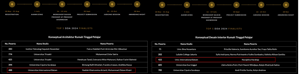 Pada malam puncak Daikin Designer Awards yang diselenggarakan di Hotel The St. Regis, Jakarta, Nadiah Khairunnisa dan Muhammad Zinade berhasil meraih Juara 2 dalam kategori Desain Arsitektur Rumah Tinggal Pelajar. Tidak hanya itu, prestasi lain juga diraih oleh Nurajdina Harahap yang berhasil masuk dalam Top 5 Finalist kategori Desain Interior Rumah Tinggal Pelajar. Kedua tim ini didampingi oleh dosen pembimbing, Tri Sutrisno, S.T., M.PWK., yang turut berperan besar dalam proses bimbingan dan pengembangan karya mereka.