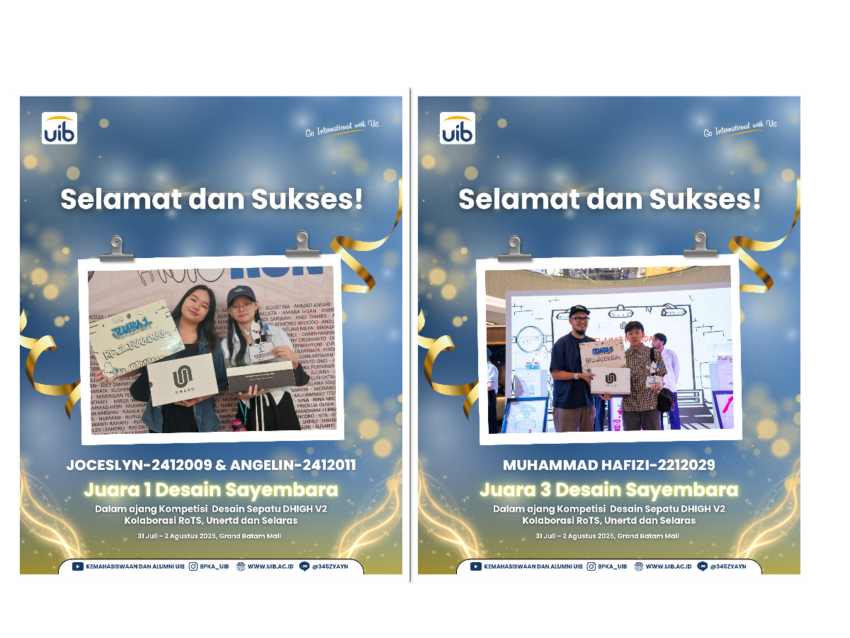 Dalam ajang ini, Joceslyn (2412009) dan Angelin (2412011) berhasil meraih Juara 1 Desain Sayembara, sedangkan Muhammad Hafizi (2212029) berhasil menorehkan prestasi sebagai Juara 3 Desain Sayembara. Prestasi ini sekaligus menjadi bukti nyata bahwa mahasiswa UIB mampu bersaing dan berprestasi di tingkat nasional dengan menampilkan karya inovatif serta penuh nilai estetika.