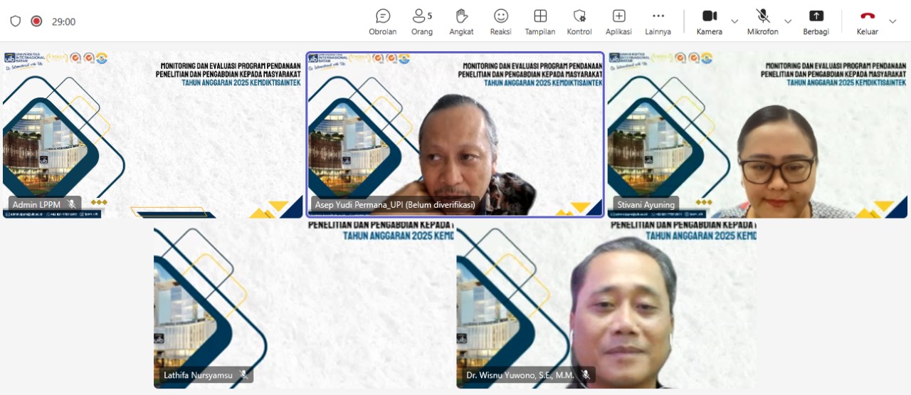 Batam, 20 Oktober 2025 – Lembaga Penelitian dan Pengabdian kepada Masyarakat Universitas Internasional Batam (LPPM UIB) mengadakan Monitoring dan Evaluasi (Monev) internal oleh program penelitian pendanaan Direktorat Penelitian dan Pengabdian kepada Masyarakat (DPPM) Kementerian Pendidikan Tinggi, Sains, dan Teknologi (Kemdiktisaintek) Tahun Anggaran 2025 yang berlangsung pada Jumat, 17 Oktober 2025, pukul 11.00 hingga 12.00 melalui Microsoft Teams.