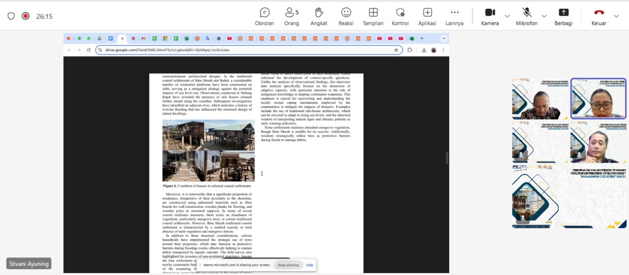 Ketua Peneliti, Stivani Ayuning Suwarlan, S.T., M.T., Ph.D. memaparkan kemajuan penelitian yang telah dilakukan dalam kesempatan tersebut. Prof. Dr. Ir. Asep Yudi Permana, M.Des menilai positif bahwa penelitian ini sesuai dengan proposal penelitian yang diajukan dan luaran yang dihasilkan dapat menjadi acuan kebijakan dan perencanaan wilayah pesisir yang mendukung keberlangsungan sosial ekonomi dan lingkungan masyarakat pesisir. Selain itu, keefektifitasan penggunaan anggaran selama melakukan penelitian juga dievaluasi serapannya. “Seluruh kegiatan penelitian berjalan sesuai dengan jadwal dan tahapan dalam proposal. Diharapkan penelitian ini menjadi potensi kuat pengembangan model replikasi di wilayah pesisir lain di luar Kota Batam”, tutur Asep.