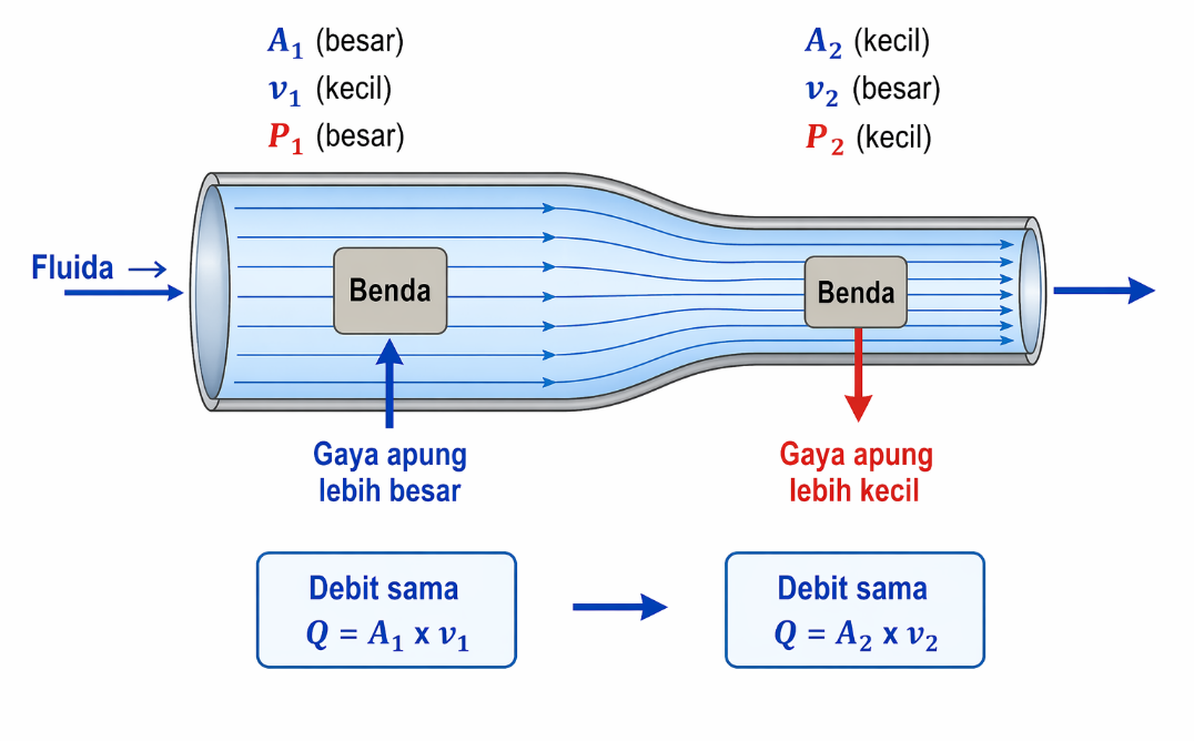 Berdasarkan ilustrasi di atas, meskipun debit aliran (Q) sama di kedua penampang, kecepatan (v) dan tekanan (P) berbeda. Pada penampang besar (A1), kecepatan kecil dan tekanan besar, sehingga gaya apung lebih besar. Pada penampang kecil (A2), kecepatan besar dan tekanan kecil, sehingga gaya apung lebih kecil. Hal ini membuktikan bahwa debit aliran, melalui pengaruhnya terhadap kecepatan dan tekanan, secara langsung mempengaruhi besar gaya apung pada fluida dinamis.