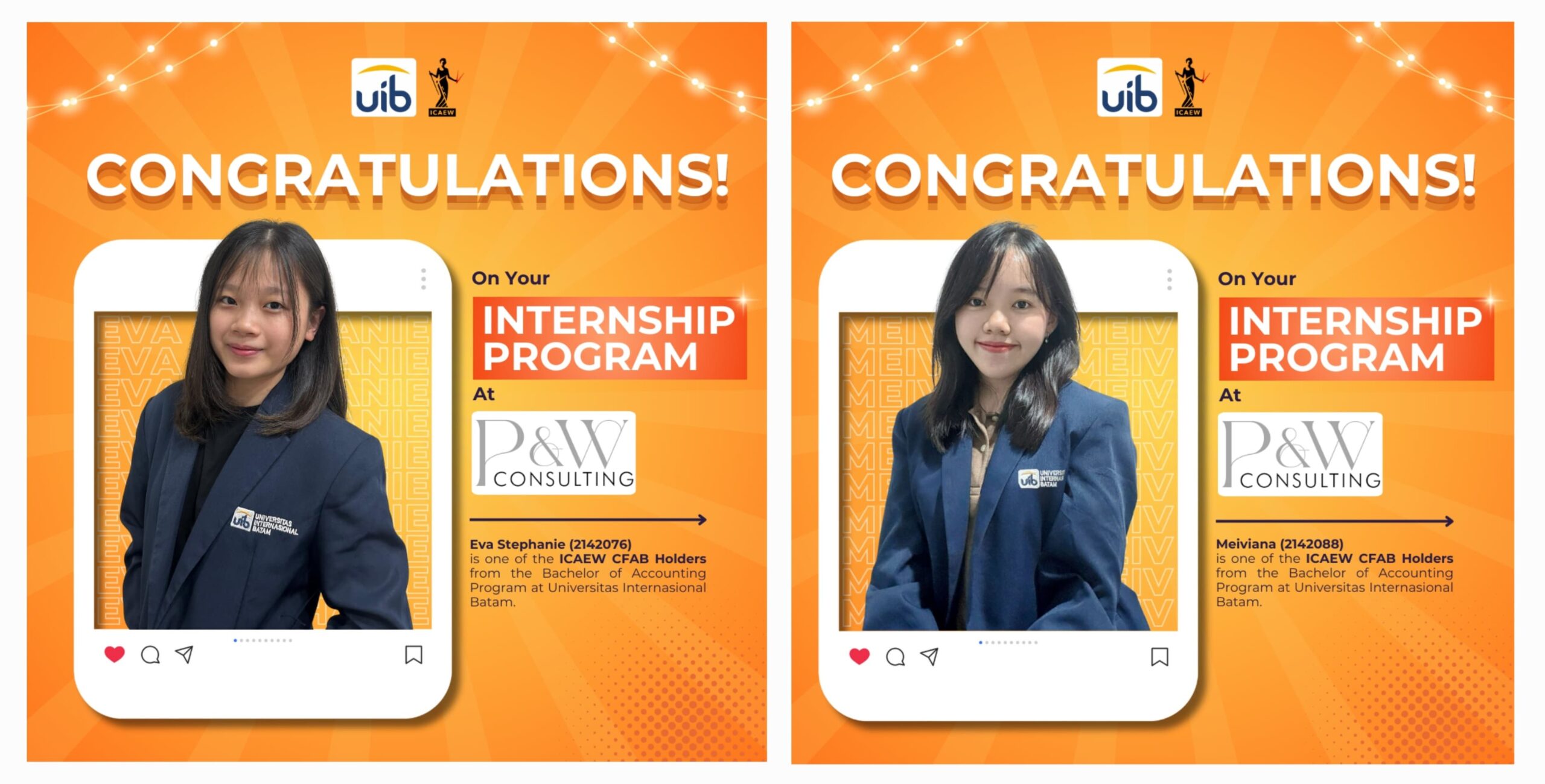 Batam, 20 November 2024 – Prodi Akuntansi Universitas Internasional Batam (UIB kembali mencatatkan prestasi gemilang dengan keberhasilan dua mahasiswa Akuntansi, Eva Stephanie (2142076) dan Meiviana (2142088), yang terpilih untuk mengikuti program internship di KAP Big 4 P&W Consulting Singapore. P&W Consulting sendiri yang menawarkan kesempatan magang ini kepada mahasiswa UIB sebagai bentuk pengakuan terhadap kualitas pendidikan dan kompetensi yang dimiliki oleh mahasiswa Akuntansi UIB. Program internship ini akan berlangsung dari Januari hingga Juni 2025.