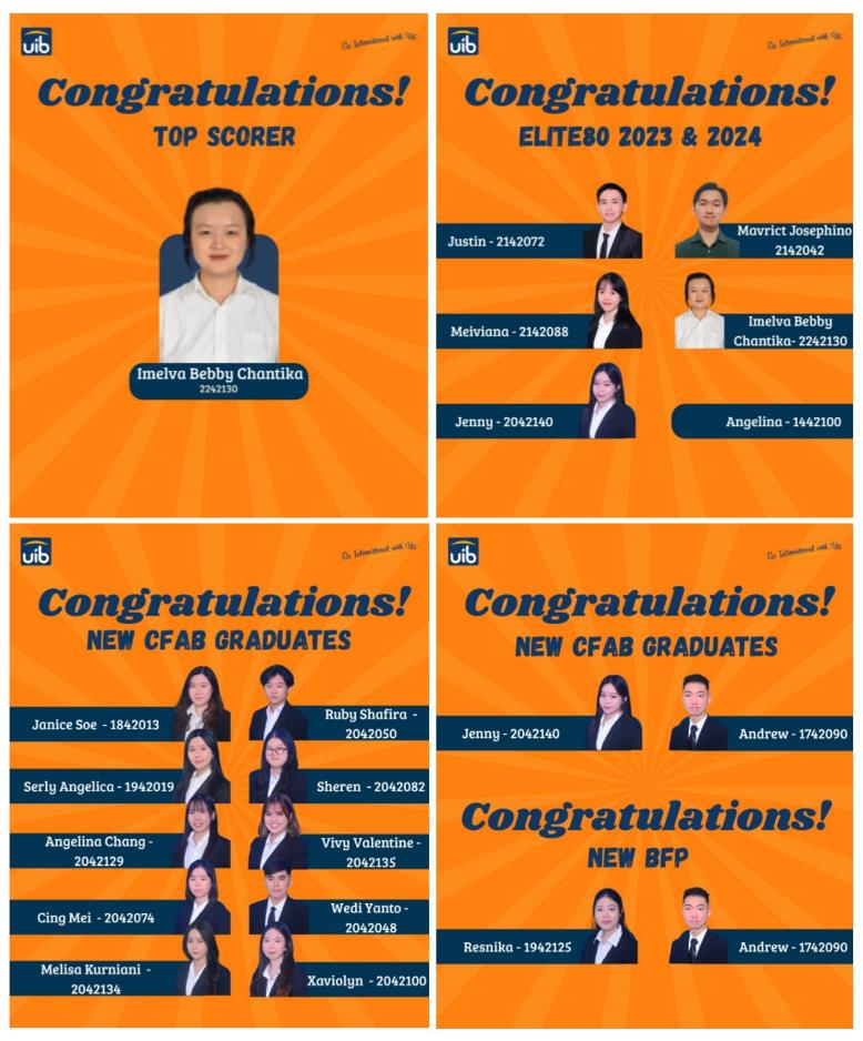Prodi Akuntansi UIB senantiasa berkomitmen untuk mendorong mahasiswa agar aktif mengikuti berbagai program sertifikasi internasional dan kompetisi lainnya. Setiap tahunnya, mahasiswa UIB secara konsisten berhasil masuk dalam daftar Elite80 maupun meraih penghargaan lain dari ICAEW, yang menunjukkan keberlanjutan prestasi di tingkat internasional. Prestasi ini menjadi kebanggaan kampus dan diharapkan dapat menginspirasi generasi mahasiswa berikutnya. Dengan dukungan dosen, kurikulum, dan fasilitas yang berkualitas, UIB optimistis dapat terus mencetak lulusan yang unggul dan berintegritas di masa mendatang.