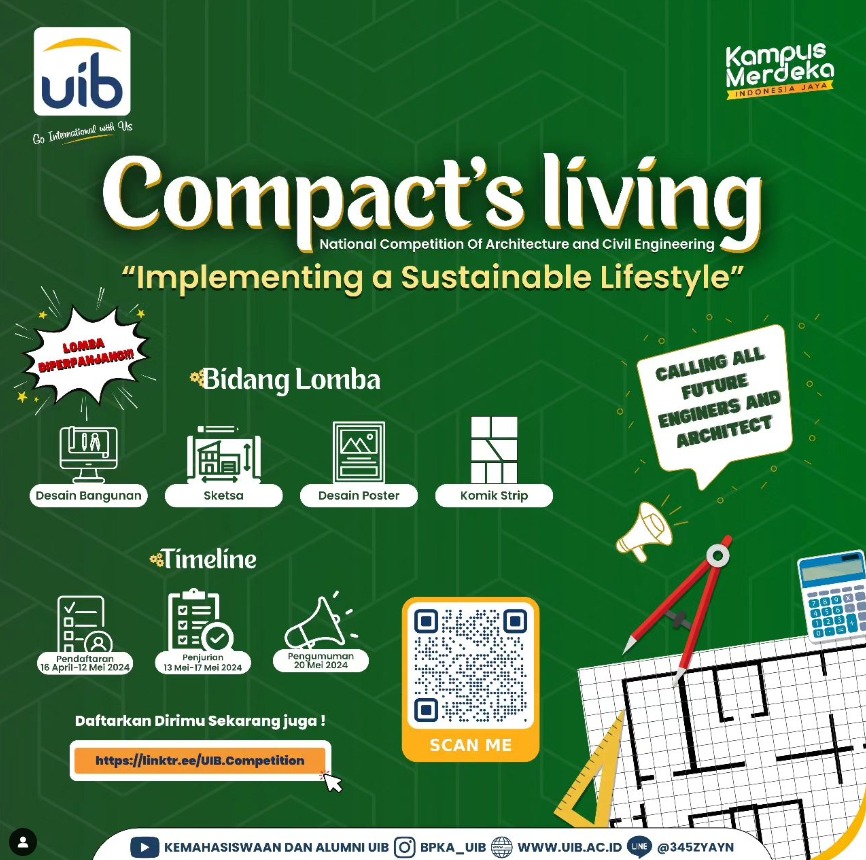 Batam, 20 Mei 2024 – Fakultas Teknik Sipil dan Perencanaan (FTSP) bekerja sama dengan Biro Pengembangan Kemahasiswaan dan Alumni (BPKA) Universitas Internasional Batam (UIB) telah sukses menyelenggarakan lomba berskala nasional Compact’s Living (Competition of Architecture and Civil Engineering) dengan tema Implementing a Sustainable Lifestyle. Lomba ini bertujuan untuk mengasah kemampuan mahasiswa, terutama di bidang Arsitektur dan Teknik Sipil, dalam hal gambar dan desain bangunan serta kawasan yang mendukung gaya hidup yang berkelanjutan. Kegiatan ini diikuti oleh mahasiswa dari berbagai kampus di seluruh Indonesia.