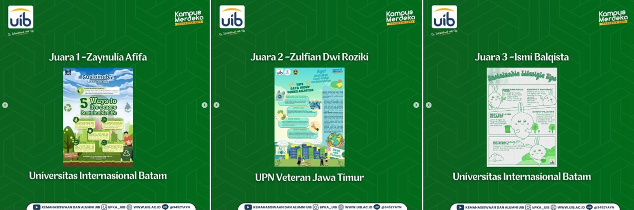 Pada lomba desain poster, peserta diminta membuat kiat-kiat untuk mengaplikasikan gaya hidup sehat atau sustainable lifestyle. Peserta menyajikan poster dengan ringkas dan padat disertai dengan ilustrasi yang menarik. Pada lomba ini, salah satu mahasiswa Arsitektur UIB berhasil meraih juara ke-3.