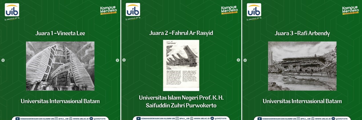 Untuk lomba sketsa, peserta diminta menggambar bangunan yang menerapkan prinsip berkelanjutan. Peserta menggambar berbagai macam bangunan, mulai dari rumah adat hingga bangunan modern. Dari sini kita bisa melihat bahwa bangunan yang menerapkan prinsip sustainable tidak hanya bisa diterpakan pada bangunan tradisional tetapi juga bangunan modern. Pada bidang lomba ini, 2 orang mahasiswa Arsitektur UIB berhasil meraih juara 1 dan 3.
