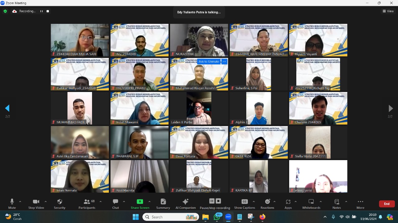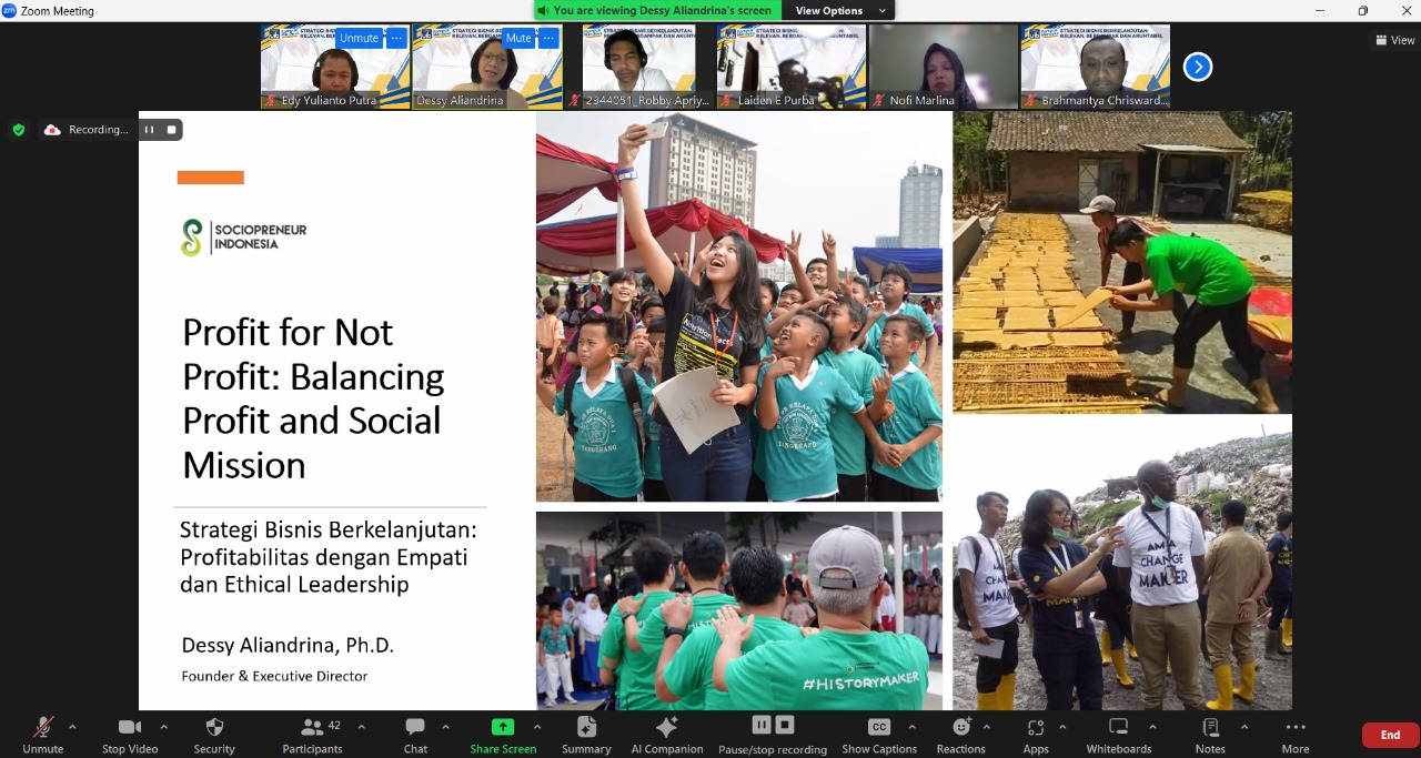 Edy Yulianto, S.M., M.M., Sekretaris Program Studi Magister Manajemen, bertindak sebagai moderator dalam webinar ini, memastikan diskusi berjalan lancar dan interaktif. Sesi utama webinar ini menghadirkan narasumber utama, Dessy Aliandrina, Ph.D., CEO SociopreneurID, yang memberikan wawasan mendalam tentang implementasi strategi bisnis berkelanjutan yang berdampak nyata di lapangan. Ibu Dessy Aliandrina, Ph.D. berbagi pengalaman tentang berbagai proyek yang berhasil mengintegrasikan prinsip-prinsip keberlanjutan dalam operasional bisnis dan dampak positif yang dihasilkan.