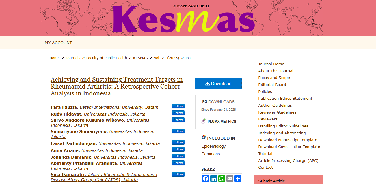 Universitas Internasional Batam (UIB) kembali menorehkan prestasi di bidang penelitian internasional. Dr. dr Fara Fauzia M.Farm, M. Epid, dosen Fakultas Kedokteran (FK) UIB, berhasil mempublikasikan hasil penelitiannya pada jurnal internasional terindeks Scopus Q4, Kesmas: Jurnal Kesehatan Masyarakat Nasional (National Public Health Journal), dengan judul “Achieving and Sustaining Treatment Targets in Rheumatoid Arthritis: A Retrospective Cohort Analysis in Indonesia”.