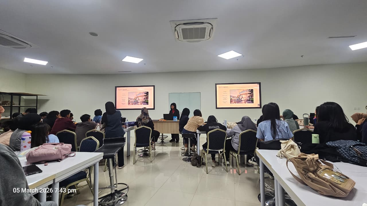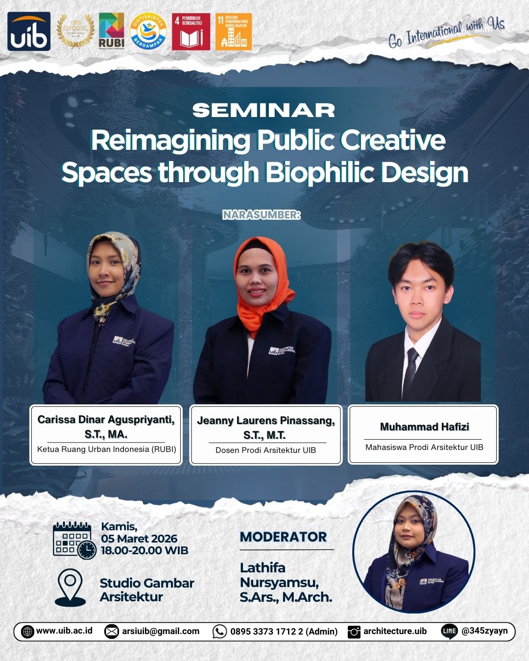 Batam, 5 Maret 2026 – Program Studi Arsitektur Universitas Internasional Batam (UIB) sukses menyelenggarakan seminar bertajuk “Reimagining Public Creative Spaces through Biophilic Design” yang dilaksanakan pada Kamis, 5 Maret 2026 di Studio Gambar Arsitektur UIB. Kegiatan ini diikuti oleh mahasiswa Program Studi Arsitektur sebagai bagian dari upaya akademik untuk memperluas wawasan mengenai perancangan ruang publik yang kreatif, inovatif, serta berkelanjutan melalui pendekatan biophilic design.