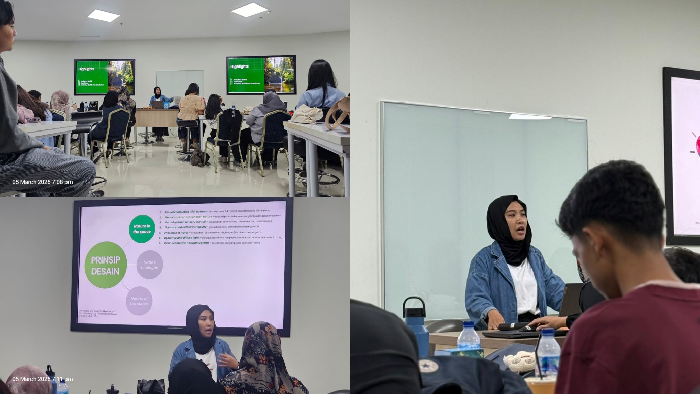 Selanjutnya, pada sesi kedua, Carissa Dinar Aguspriyanti, S.T., M.A., menyampaikan materi mengenai konsep biophilic design dalam arsitektur. Dalam penjelasannya, biophilic design merupakan pendekatan desain yang berupaya mengintegrasikan unsur-unsur alam ke dalam ruang binaan. Elemen-elemen seperti pencahayaan alami, vegetasi, sirkulasi udara yang baik, serta penggunaan material alami dinilai mampu menciptakan lingkungan yang lebih sehat, nyaman, serta meningkatkan kualitas pengalaman ruang bagi penggunanya. Selain itu, penerapan konsep ini juga dinilai relevan untuk menjawab tantangan lingkungan di kawasan perkotaan yang semakin padat.