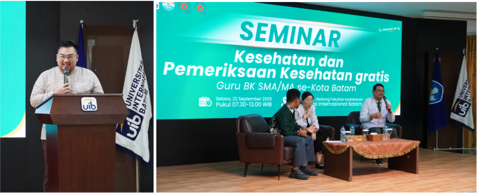 Fakultas Kedokteran Universitas Internasional Batam (UIB) resmi menggelar kegiatan Seminar Kesehatan dan Pemeriksaan Kesehatan Gratis pada Selasa, 23 September 2025. Acara yang berlangsung di Aula Lantai 2 Gedung Fakultas Kedokteran UIB ini dihadiri oleh 45 Guru Bimbingan Konseling (BK) SMA/MA se-Kota Batam dan berlangsung mulai pukul 07.30 hingga 13.00 WIB.