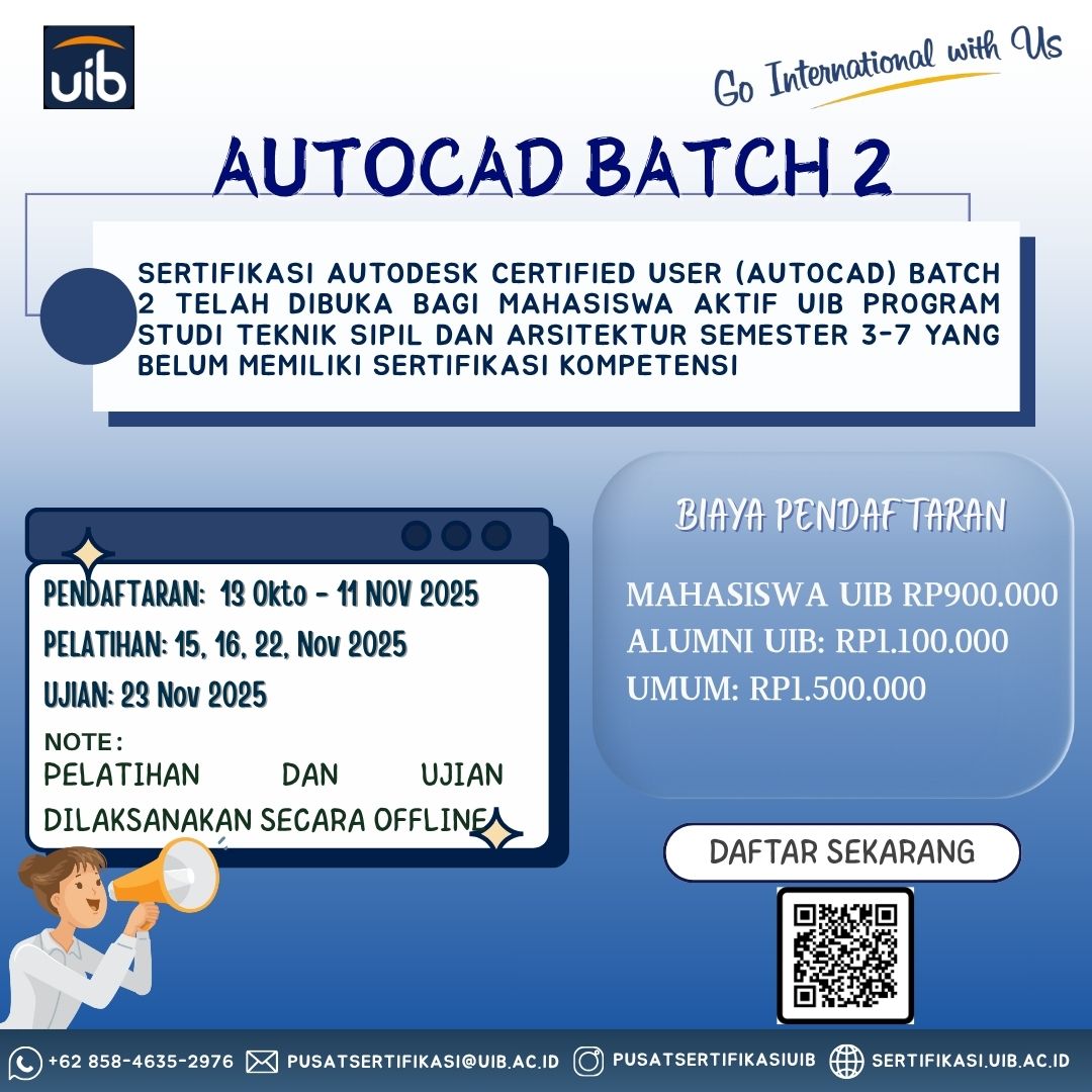 Batam, 24 November 2025 Program Studi Arsitektur Universitas Internasional Batam (UIB) kembali mendorong peningkatan kompetensi mahasiswa melalui keikutsertaan dalam Sertifikasi Autodesk Certified User (AutoCAD) Batch 2 yang resmi dibuka pada 13 Oktober–11 November 2025. Kegiatan ini merupakan bagian dari upaya penguatan keahlian teknis bagi mahasiswa Teknik Sipil dan Arsitektur semester 3–7 yang belum memiliki sertifikasi kompetensi.