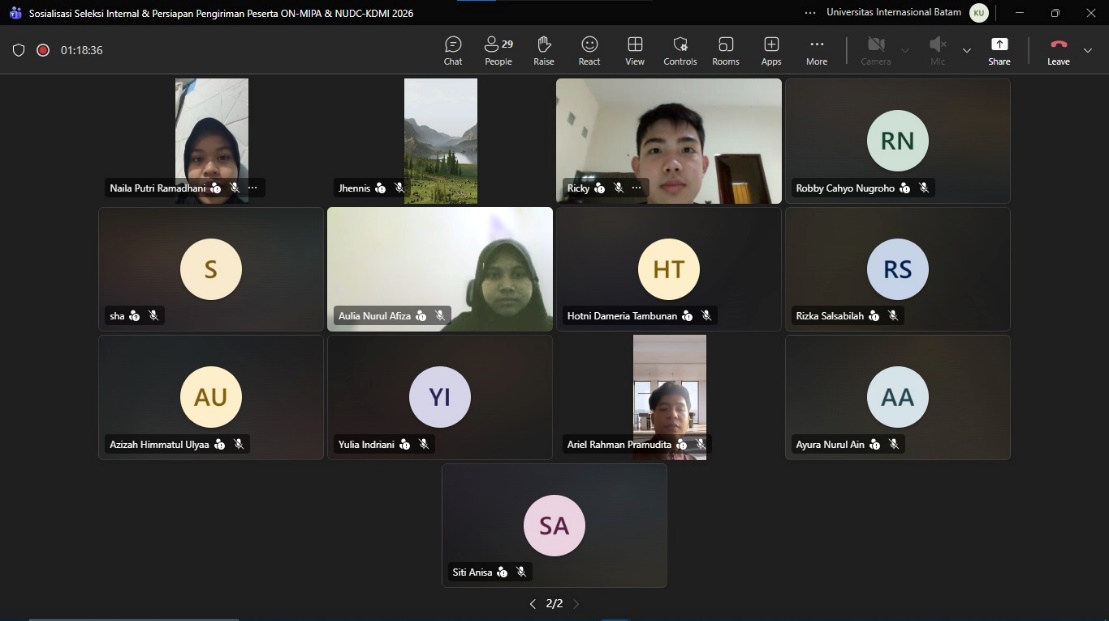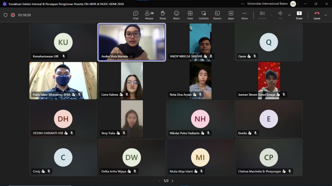Biro Pengembangan Mahasiswa dan Alumni (BPKA) Universitas Internasional Batam (UIB) pada Jumat, 13 Februari 2026, melaksanakan kegiatan Sosialisasi Kompetisi National University Debating Championship (NUDC), Kompetisi Debat Mahasiswa Indonesia (KDMI), dan Olimpiade Nasional Matematika dan Ilmu Pengetahuan Alam (ONMIPA) secara daring melalui platform virtual meeting. Kegiatan ini menjadi langkah awal dalam menjaring serta mempersiapkan mahasiswa terbaik UIB untuk berkompetisi di tingkat nasional. Kegiatan dibuka oleh Kepala Biro Pengembangan Mahasiswa dan Alumni, Bapak Putra Sabar Hotman Sihombing, S.Kom., M.M., kemudian dilanjutkan dengan sesi sosialisasi kepada mahasiswa.