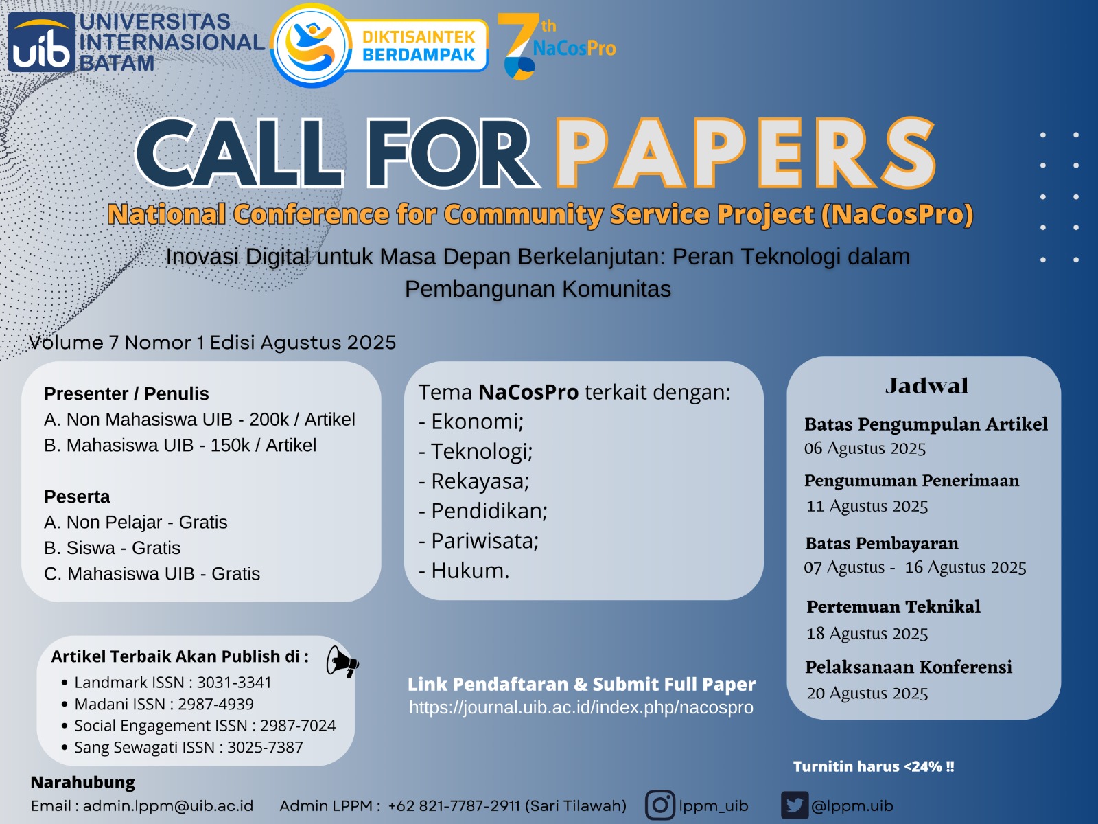Community service as one of the implementation of Three Pillars of Higher Education has an essential role to the development of science, technology, and arts and to improve the welfare of society since it is implemented directly to the partners or society. To spread more significant impacts, one of the activities is by conducting a national conference and call for papers for lecturers, students, and society to disseminate or present the results of the practice of community service