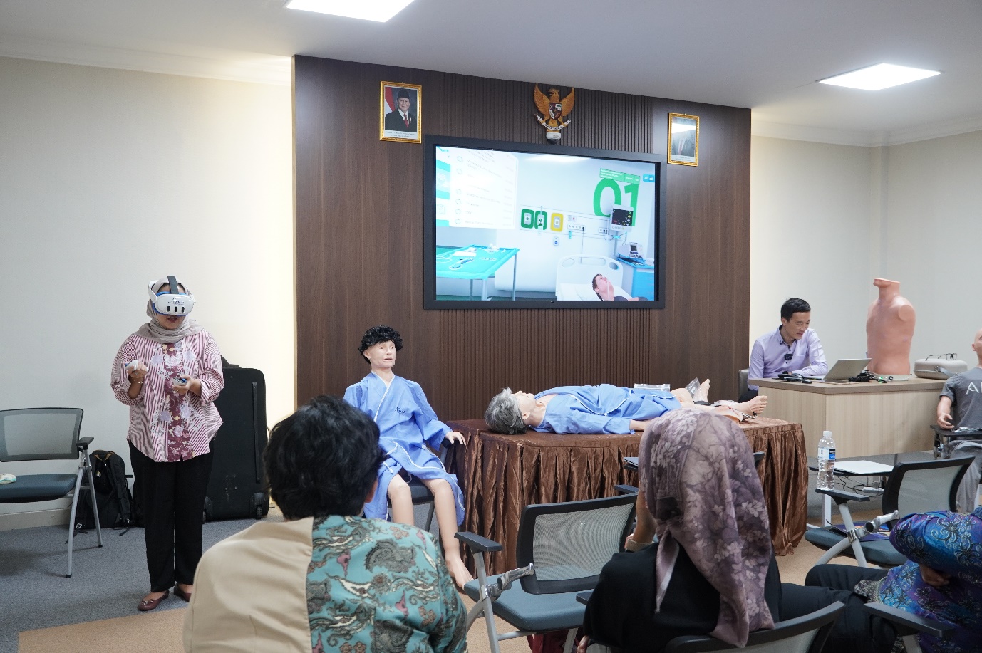 Tak hanya itu, Mr. Louis Teo juga menampilkan alat simulasi berbasis Virtual Reality (VR) yang membawa pengguna ke berbagai lingkungan medis, seperti ruang gawat darurat, klinik, hingga helikopter ambulans. Teknologi VR ini memberikan pengalaman imersif yang sangat bermanfaat untuk mengasah soft skills dan kemampuan pengambilan keputusan mahasiswa dalam situasi darurat.
