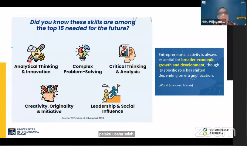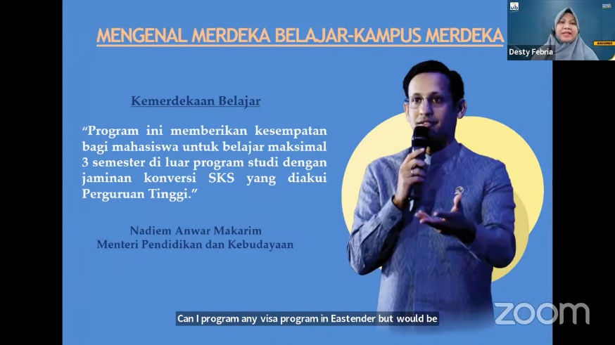 Sesi pertama webinar diawali dengan sosialisasi Program Merdeka Belajar Kampus Merdeka (MBKM) yang kini menjadi salah satu program unggulan Kementerian Pendidikan, Kebudayaan, Riset, dan Teknologi. Dua pembicara ternama, Bapak Heru Wijayanto Ariyanto, S.Kom., M.M., MBA., M.MT, Co-Founder dan Operations Manager Sociopreneur.id, dan Ibu Desty Febria, S.Pd., M.TESOL., Kepala Pusat MBKM UIB, menjadi narasumber utama. Mereka menyampaikan berbagai informasi terkait kebijakan program yang memungkinkan mahasiswa untuk belajar di luar jurusan atau bahkan di luar kampus.