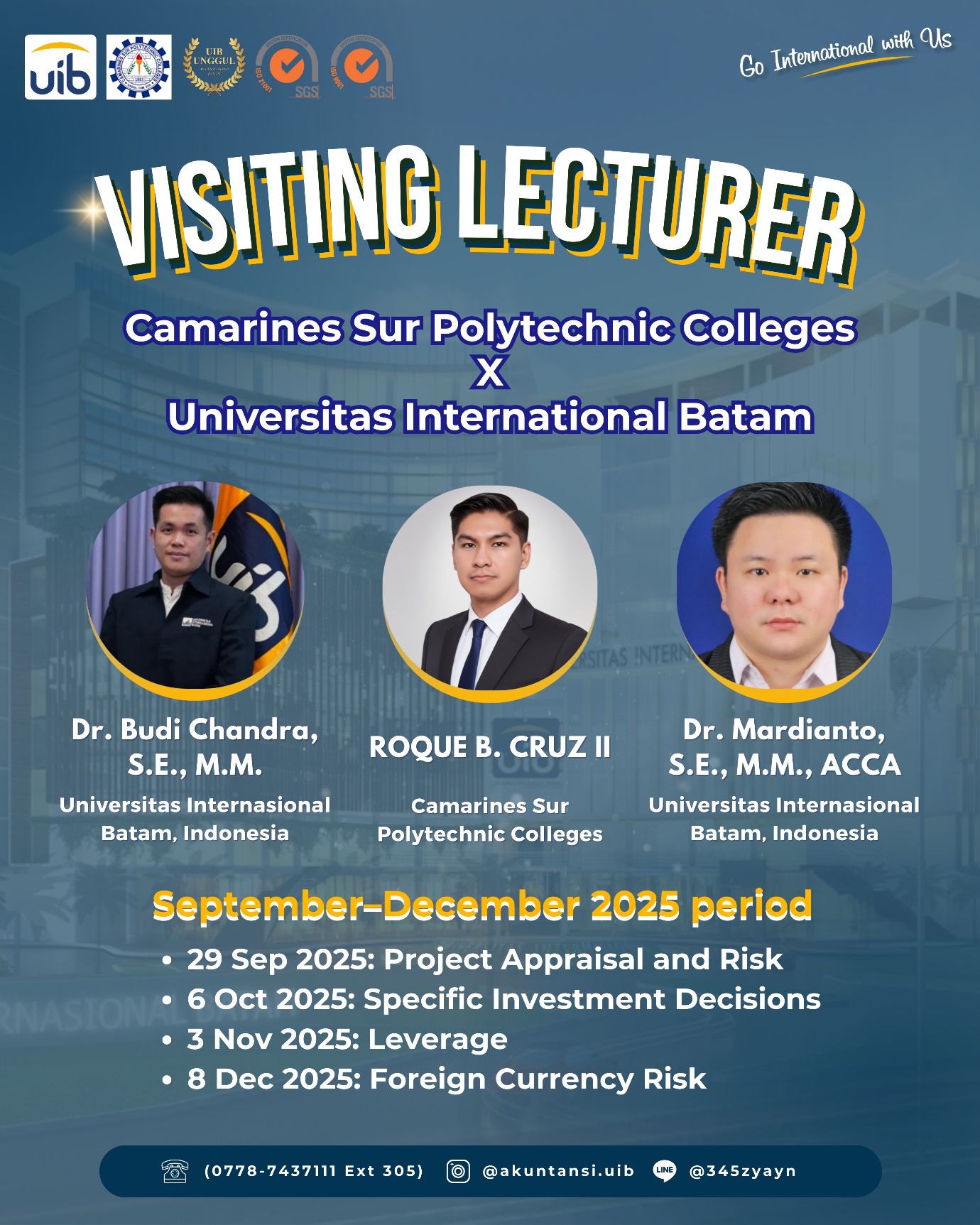 Selasa, 16 Desember 2025 – Program Studi Akuntansi Universitas Internasional Batam (UIB) kembali menunjukkan komitmennya dalam memperkuat kualitas akademik dan jejaring internasional melalui penyelenggaraan kegiatan Visiting Lecturer bekerja sama dengan Camarines Sur Polytechnic Colleges (CSPC), Filipina. Kegiatan ini dilaksanakan secara berkelanjutan pada periode September hingga Desember 2025.Kegiatan Visiting Lecturer ini menghadirkan kolaborasi akademik lintas negara dengan melibatkan dosen-dosen dari kedua institusi. Dari Universitas Internasional Batam, kegiatan ini diisi oleh Dr. Budi Chandra, S.E., M.M. dan Dr. Mardianto, S.E., M.M., ACCA, sementara dari Camarines Sur Polytechnic Colleges diwakili oleh Roque B. Cruz II. Kehadiran para narasumber memberikan perspektif akademik dan praktis yang komprehensif bagi mahasiswa.