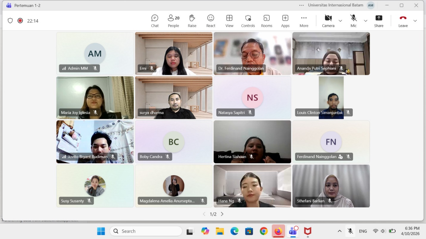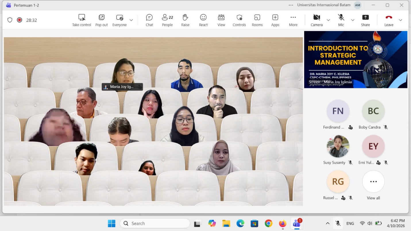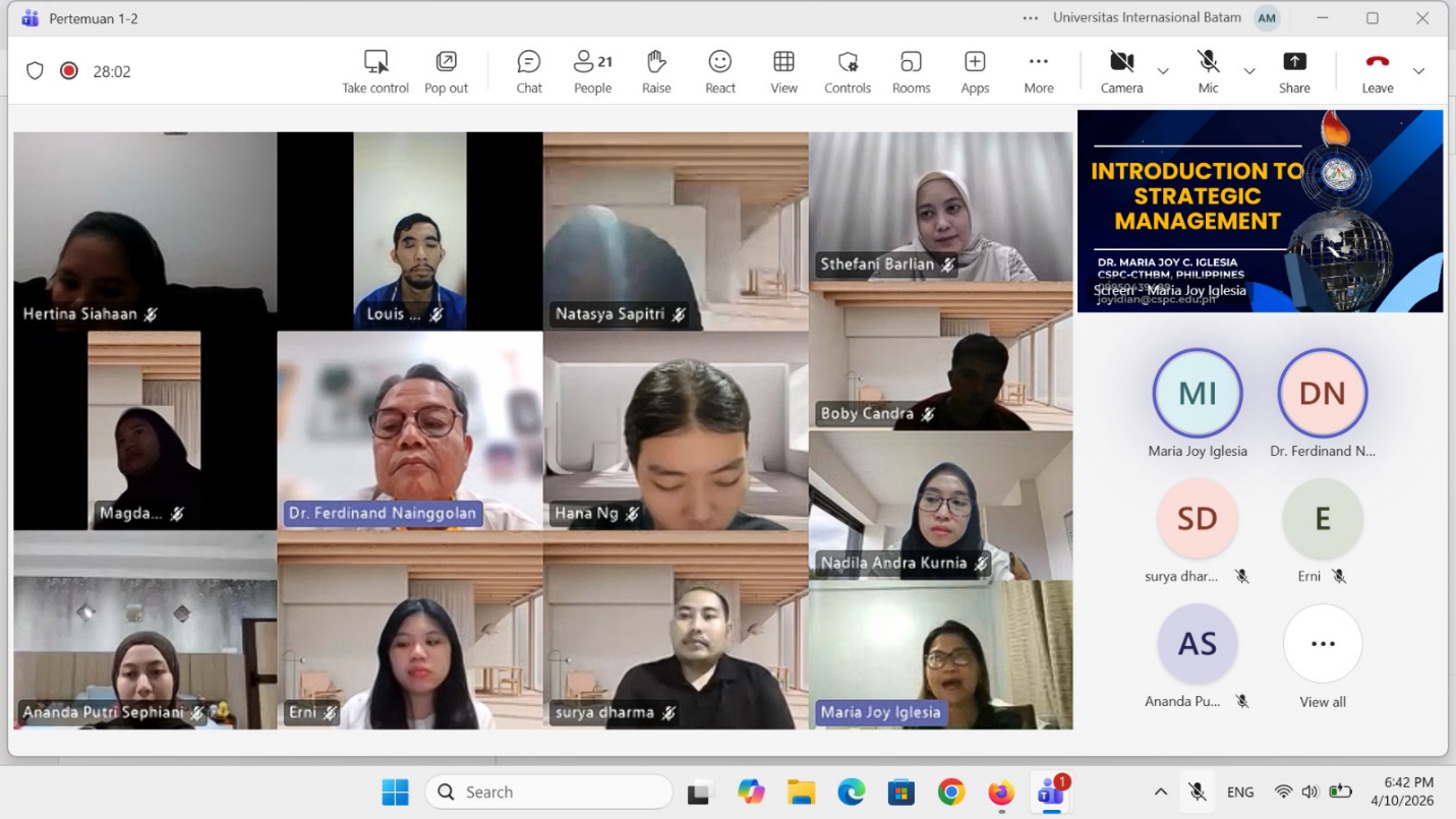 Pada hari Jumat, 10 April 2026, telah dilaksanakan kegiatan Visiting Lecturer yang diselenggarakan oleh Program Studi Magister Manajemen Universitas Internasional Batam. Kegiatan ini menghadirkan narasumber internasional, yaitu Dr. Maria Joy C. Iglesia dari Camarines Sur Polytechnic Colleges, Filipina. Acara ini berlangsung pada pukul 18.30 hingga 22.30 WIB dan diikuti oleh mahasiswa Magister Manajemen Batch 27 semester 2 Tahun Ajaran Genap 2025/2026.