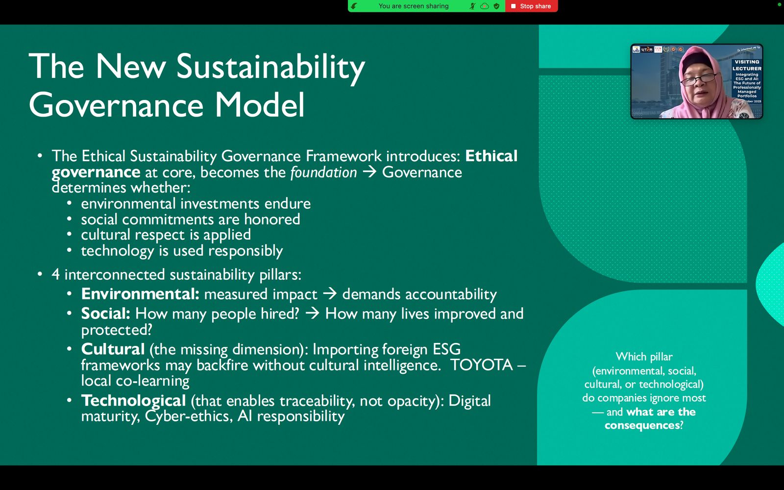 Selasa, 09 Desember 2025 – Program Studi Akuntansi Universitas Internasional Batam (UIB) kembali menyelenggarakan kegiatan Visiting Lecturer uutbound sebagai bagian dari penguatan kolaborasi akademik internasional. Pada kesempatan ini, kegiatan mengangkat tema “Integrating ESG and AI: The Future of Professionally Managed Portfolios”, yang membahas peran Environmental, Social, and Governance (ESG) serta kecerdasan buatan dalam pengelolaan portofolio profesional di masa depan. Acara dilaksanakan pada Selasa, 09 Desember 2025, pukul 12.00–2.00 PM (Malaysia Time), bertempat di Universiti Tunku Abdul Rahman (UTAR), Malaysia, serta disiarkan secara daring melalui platform Zoom untuk memungkinkan partisipasi yang lebih luas.