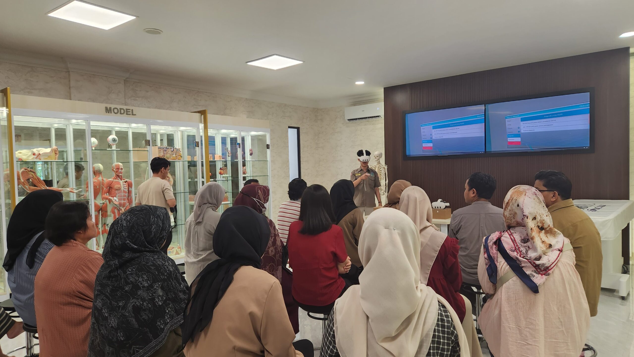 Sesi kedua dilaksanakan di ruang penyimpanan manekin keterampilan klinik dasar, dengan fokus pada penggunaan manekin untuk kebutuhan Objective Structured Clinical Examination (OSCE). Materi ini ditujukan untuk memperkuat proses pembelajaran dan evaluasi keterampilan klinis bagi mahasiswa kedokteran nantinya, serta membekali calon tenaga pengajar dan laboran dengan pemahaman teknis terhadap sarana tersebut.