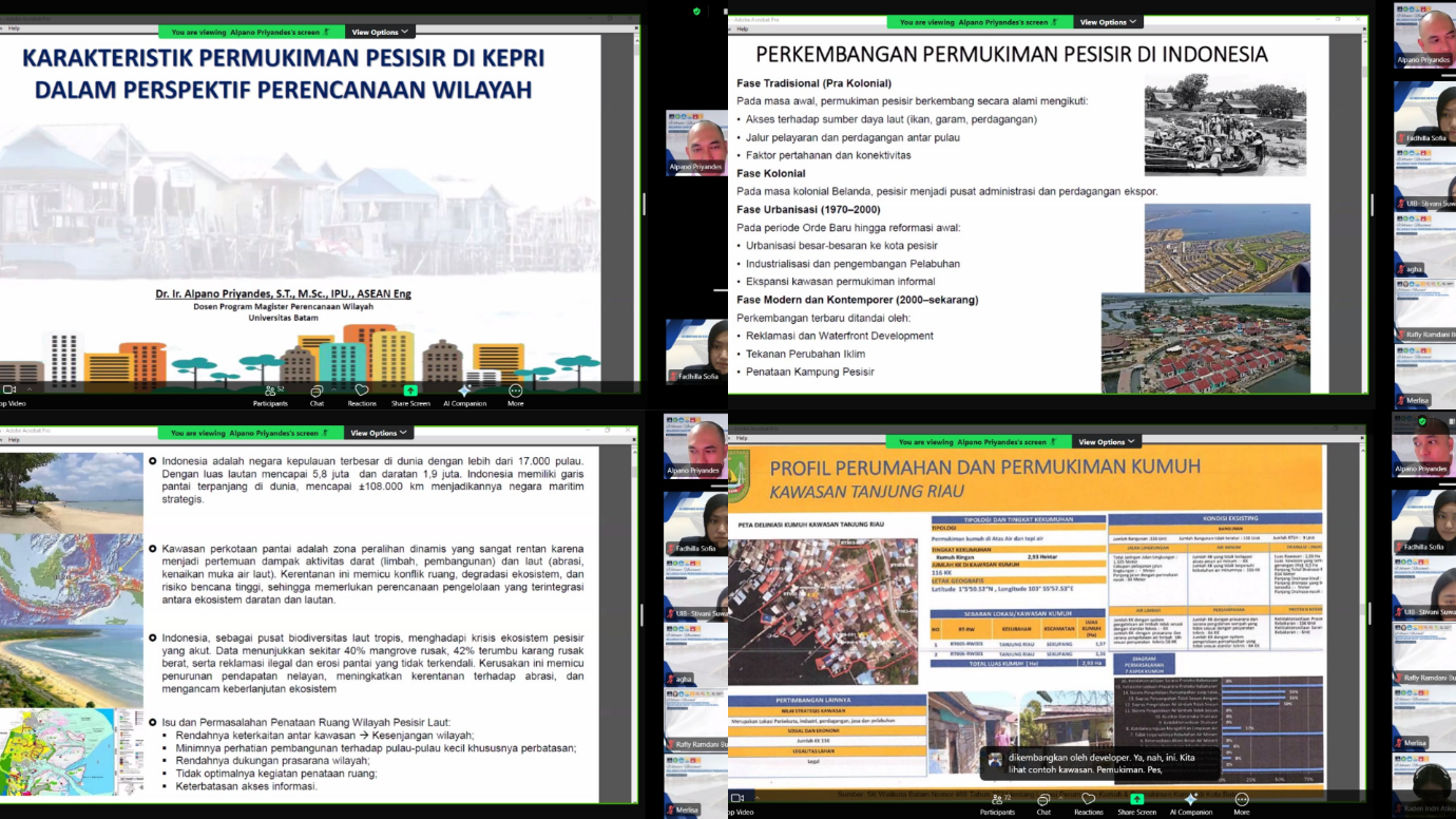 Memasuki sesi pemaparan materi, narasumber pertama, Dr. Ir. Alpano Priyandes, S.T., M.Sc., IPU., ASEAN Eng., menyampaikan materi terkait karakteristik dan perkembangan permukiman pesisir di Indonesia, khususnya di Kepulauan Riau, termasuk dinamika, tantangan, serta penataan kawasan seperti Tanjung Riau dalam perspektif perencanaan wilayah.