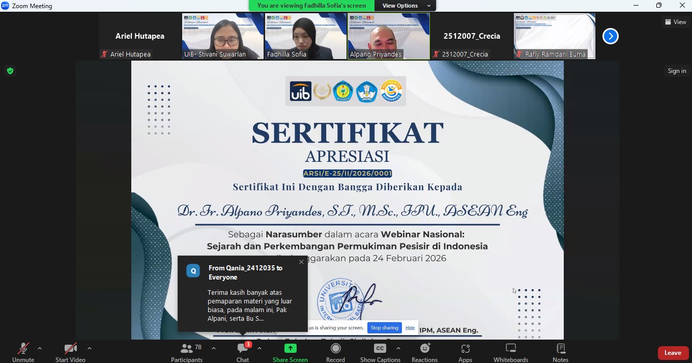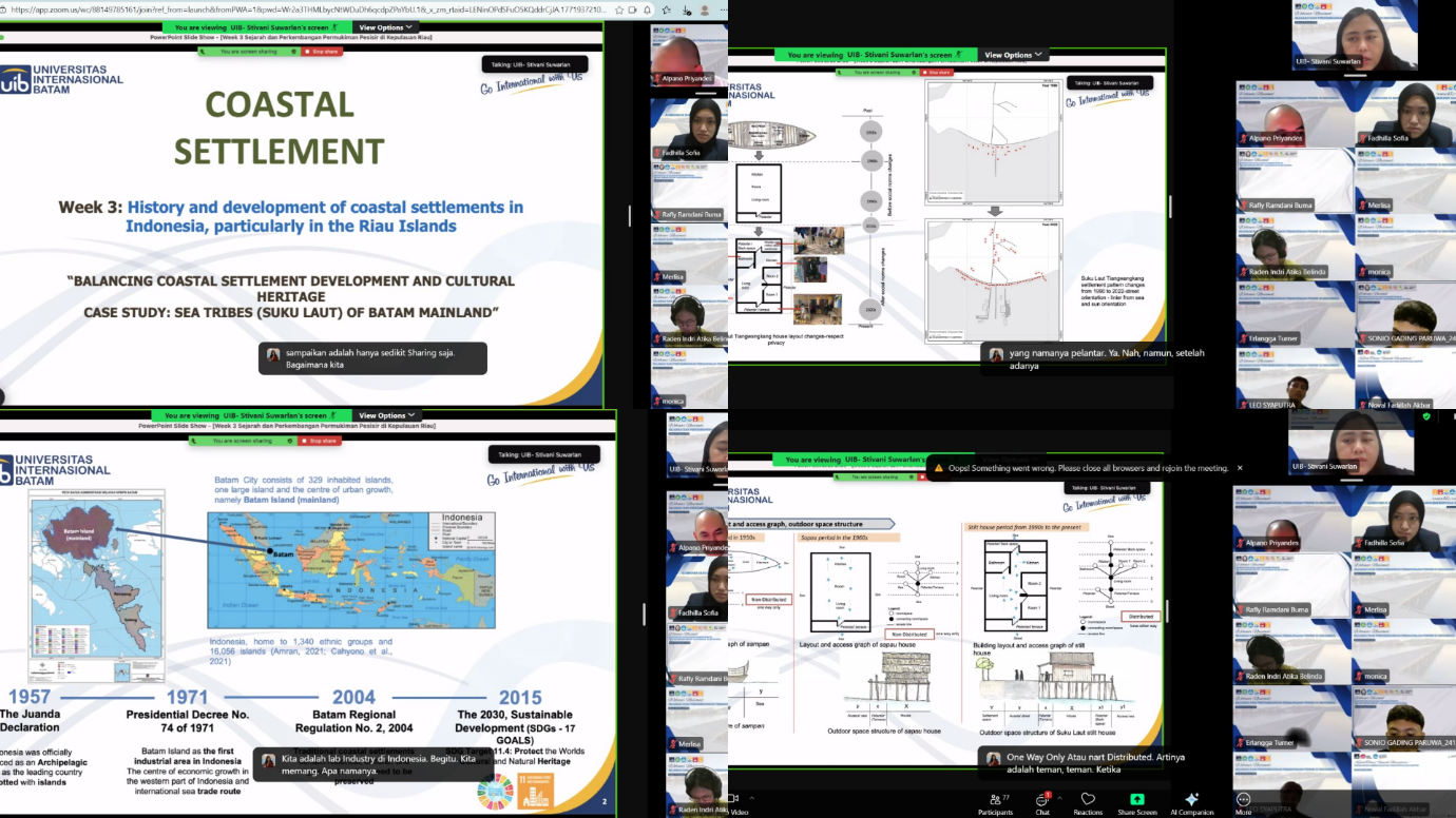 Pada Selasa, 24 Februari 2026, Program Studi Arsitektur Universitas Internasional Batam (UIB) menyelenggarakan kegiatan Webinar Nasional bertajuk “Sejarah dan Perkembangan Permukiman Pesisir di Indonesia” yang dilaksanakan secara daring melalui platform Zoom Meeting. Kegiatan ini diikuti oleh mahasiswa Universitas Internasional Batam yang berasal dari Program Studi Arsitektur.